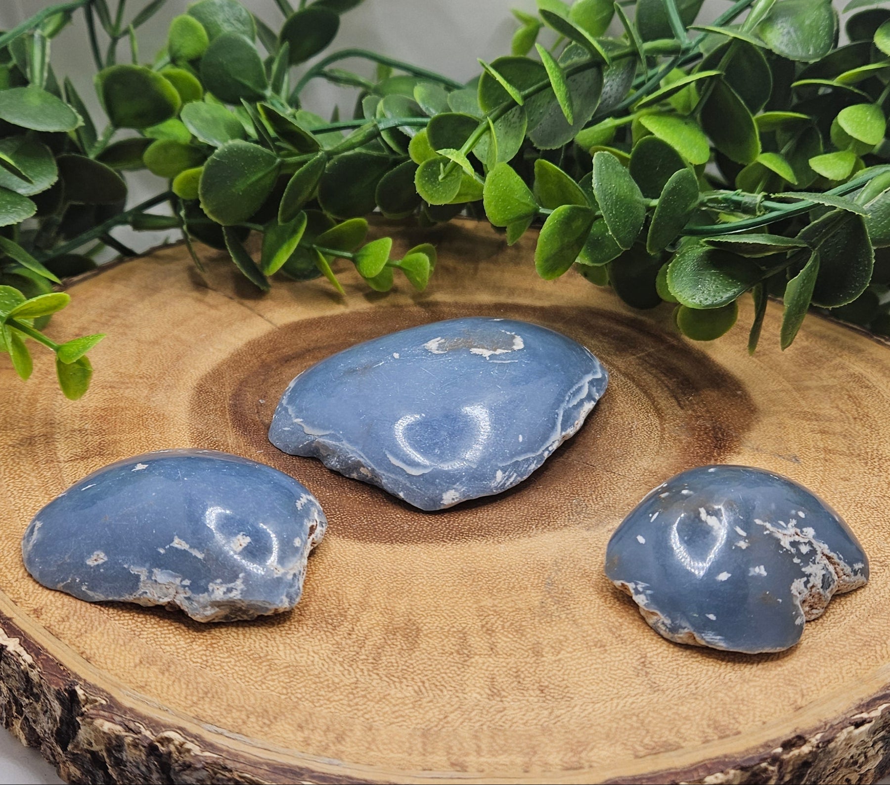 Angelite is a blue-to-blue-grey mineral, a variety of anhydrite, with physical properties including a hardness of 3.5 on the Mohs scale and a white streak.