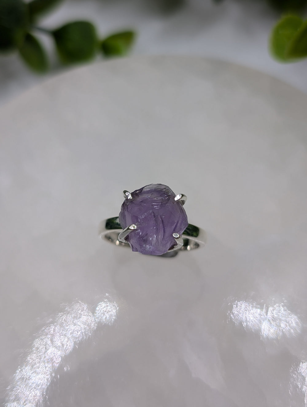Crafted with high quality materials, this Amethyst Rough Cut Sterling Silver Ring showcases the stunning beauty of raw amethyst. The rough cut design adds a unique touch to the stylish sterling silver band. Perfect for those seeking a high-quality, one-of-a-kind piece of jewelry.