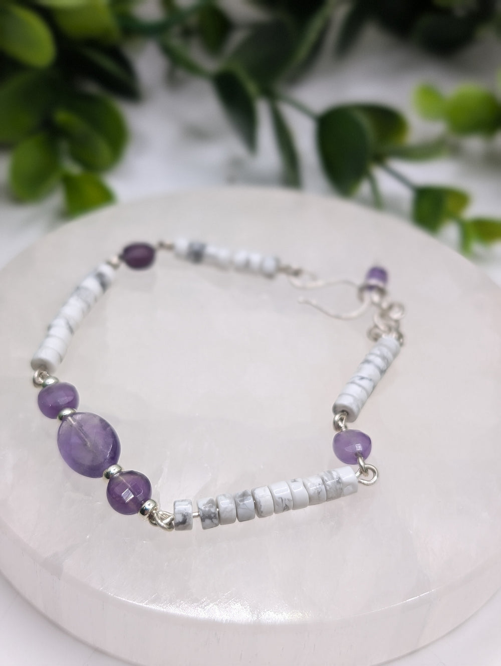 Discover the healing power of Howlite and Amethyst with our Sterling Silver Bracelet. These natural gemstones promote calmness and balance, while the sterling silver adds a touch of elegance. Perfect for those seeking peace and positivity.