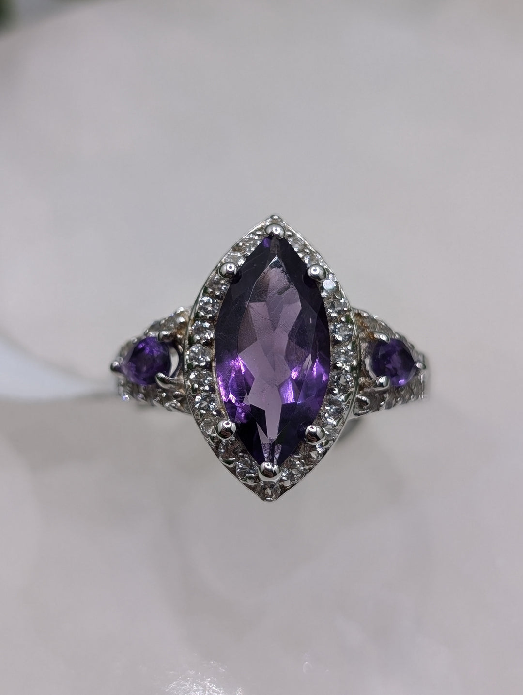 Marquise Amethyst With Topaz Sterling Silver Ring (Size 7)