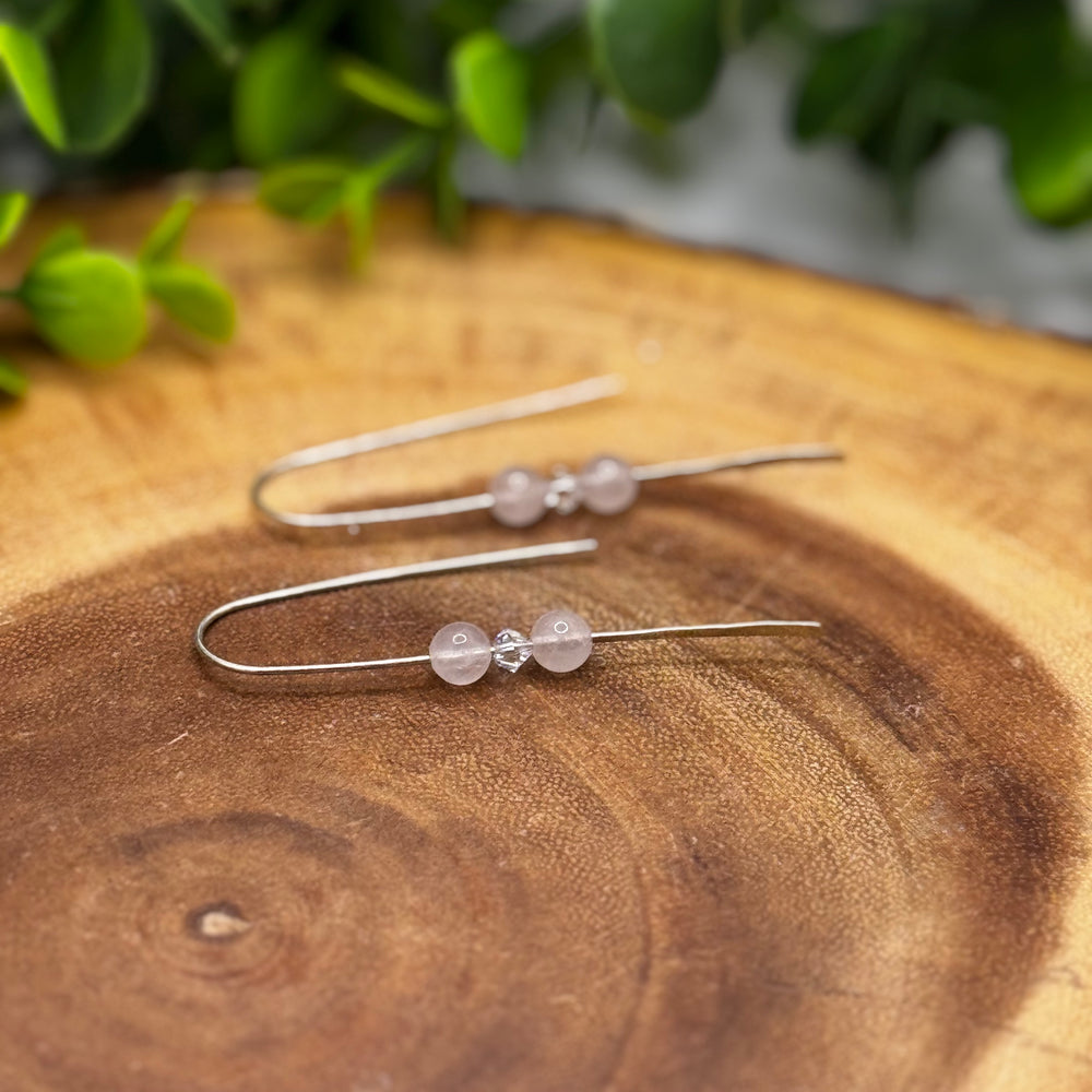 Handcrafted in house, these Rose Quartz Sterling Silver Threader Earrings feature hammered silver and high quality crystals. Elevate your style with these unique and stunning earrings that add a touch of elegance and sparkle to any outfit. Perfect for any occasion, they make a thoughtful gift for yourself or a loved one.