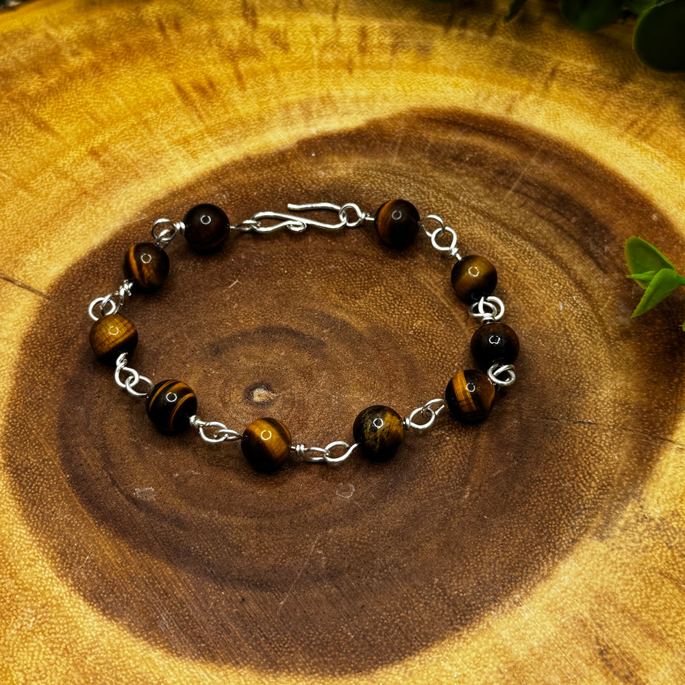 This handmade Tiger Eye Bracelet features 8mm beads, each wire wrapped with precision. The silver plated bracelet has a high quality finish and is secured with a convenient S clasp closure. Express your unique style with this beautifully crafted accessory.