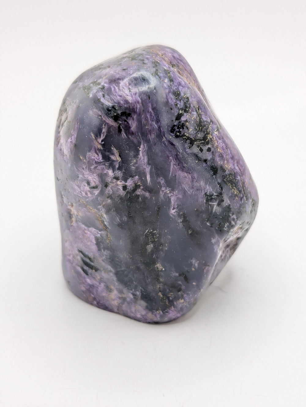 Charoite is a rare crystal with a unique mix of purple, grey, and black swirls. It has a hardness of 5.5 on the Mohs Scale and is known to be protective and calming.  Its calming energy invokes strong feelings of peace and serenity, while its protective energies keep you safe from external energies.